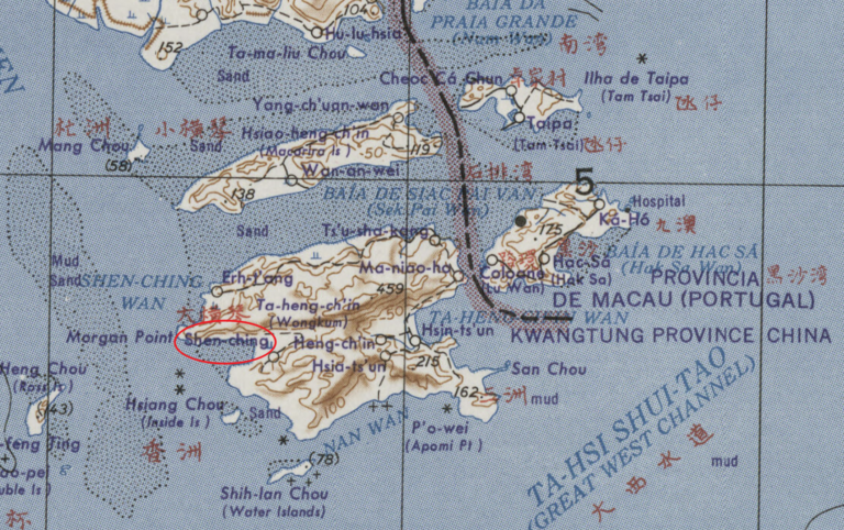 若将此图与前面两图进行对比,似乎可以认为,此图中标有“Shen-ching”之地即为云雀湾,这显然不会是“大井”;至于其汉语名称,可能为“深井”8按,今日大横琴岛有一地名为“深井村”,其位置与此图中的“Shen-ching”很接近,由此推断。。然毕竟时间有别,无法确认此名究竟为沿袭还是新设,姑且录之。
